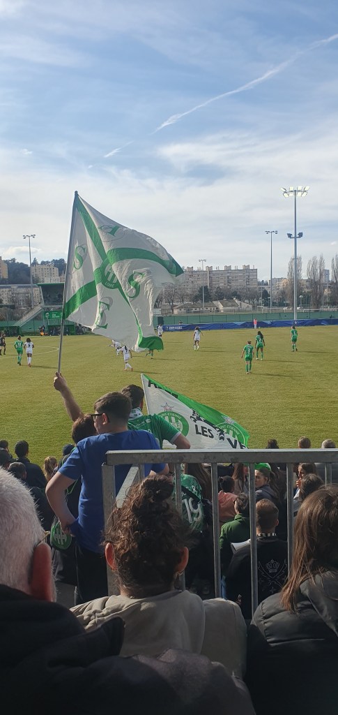 En cette journée du 8 mars, nous avons tendu notre micro, non pas à des spectatrices toutes acquises à la cause, mais à deux messieurs. Un jeune étudiant de 18 ans qui assistait pour la première fois à un match de football en direct et un supporter très engagé de l’ASSE. À les écouter, le football féminin a gagné en reconnaissance et les idées préconçues selon lesquelles les femmes ne pourraient pas livrer un jeu et un spectacle équivalents à ce que produisent les garçons n’a plus lieu d’être. Pour autant, bien que professionnelles aussi, « nos » joueuses de Ligue 1 n’ont pas du tout les mêmes conditions de travail ni les mêmes salaires que les footballeurs. Le prix des places n’est pas non plus comparable ni la capacité des stades. 1500 personnes ce jour-là, un record de fréquentation, alors que le célèbre Chaudron, à quelques centaines de mètres peut accueillir 42 000 supporters pour voir jouer (et perdre…😟) les gars ! Pourtant, la ferveur était telle autour de cette équipe féminine stéphanoise pleine d’énergie et de générosité, que nous sommes prêt-es à parier que les Vertes pourront jouer dans un futur proche au stade Geoffroy-Guichard ! Quelle belle revanche ce sera !