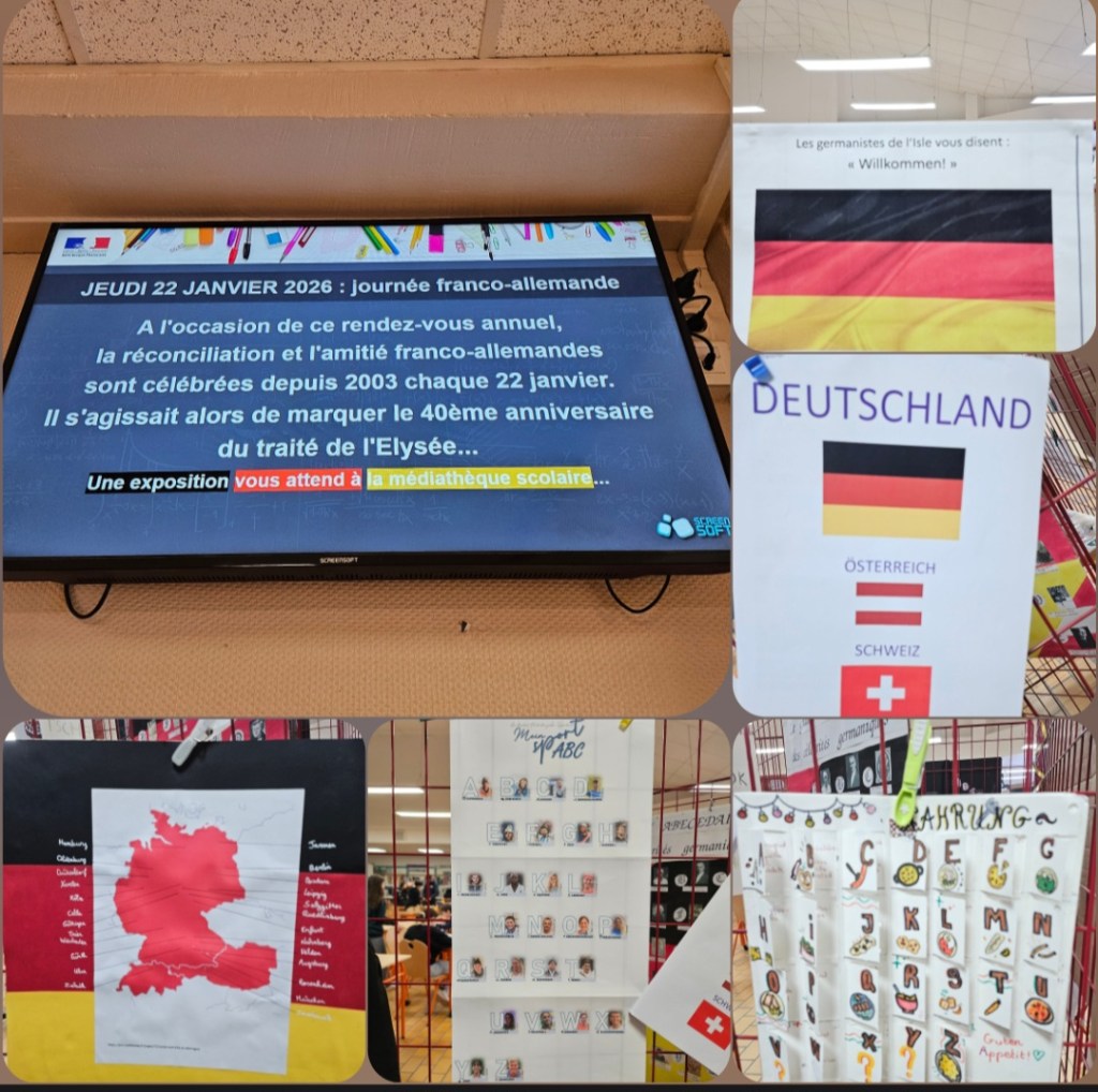En amont de la journée franco-allemande du jeudi 22 janvier 2026, les élèves germanistes du collège ont organisé et mis en scène à la médiathèque scolaire une exposition présentant à l’ensemble de la communauté scolaire leurs travaux réalisés en classe avec Frau Thomas…